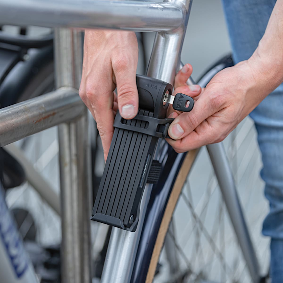 De AXA Fold Lite 80 is ideaal voor lichtgewicht fietsen en frames die buiten de norm vallen. Dit komt doordat de compacte afmetingen en de universele slothouder bijzonder handig zijn, zodat het AXA-slot gemakkelijk aan de fiets kan worden geplaatst. Dit maakt het eenvoudig om de Fold Lite binnen handbereik te integreren, zelfs op onhandig vormgegeven frames, voor gebruiksgemak. Hij kan stevig worden vastgeschroefd aan de bidonhouderbevestiging of ergens anders worden gemonteerd met behulp van een bevestigingsriem. Bij dagelijks gebruik wordt de rubberen band waarmee het vouwslot in de houder is bevestigd in een handomdraai losgemaakt en weer vastgehaakt.